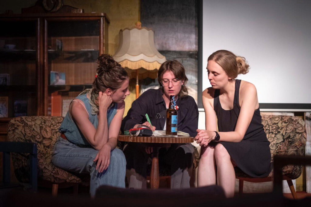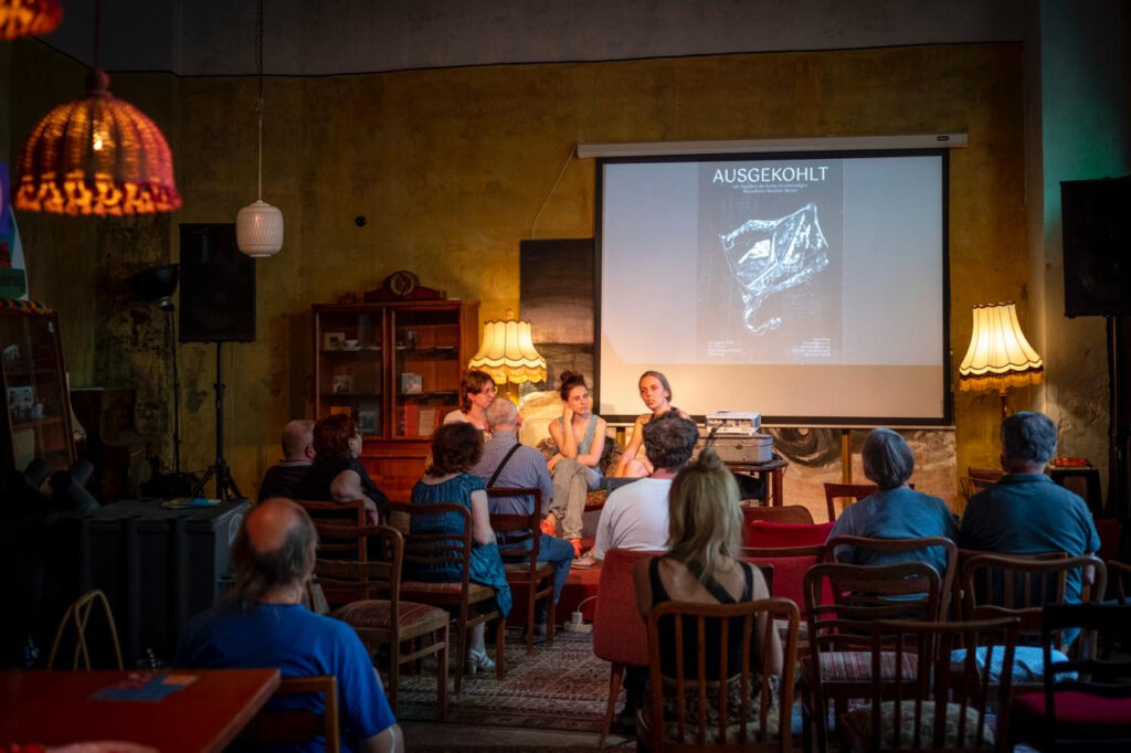 Theresa Münnich, Sophia Berg und Katharina Kern gewähren Einblicke in ihre künstlerischen Arbeits- und Rechercheprozesse rund um das Thema Braunkohle, die im Rahmen und Nachgang einer